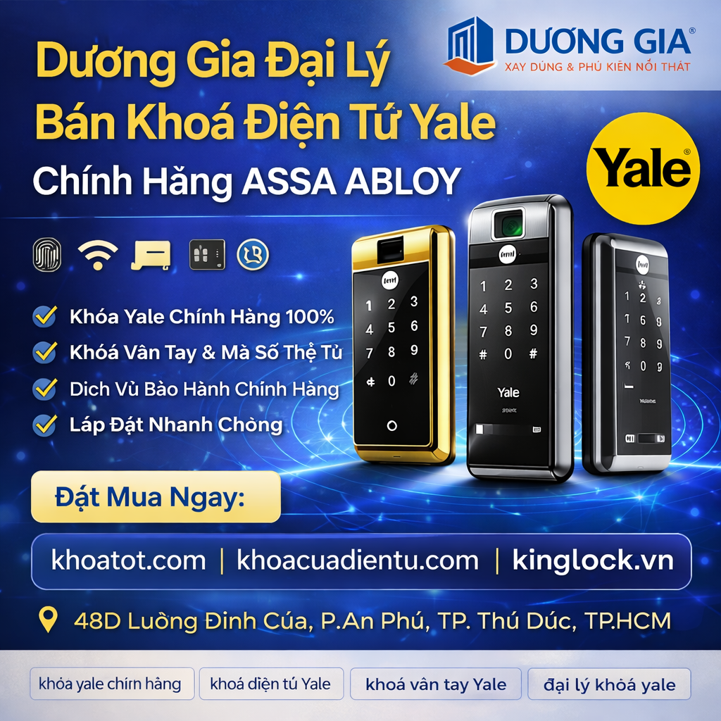 Với nhiều năm kinh nghiệm trong lĩnh vực thiết bị an ninh và phụ kiện nội thất, Công ty Cổ phần Xây dựng và Phụ kiện Nội thất Dương Gia đã trở thành một trong những đơn vị phân phối khóa điện tử Yale uy tín tại Việt Nam. Việc lựa chọn Dương gia đại lý bán khoá điện tử Yale không chỉ giúp khách hàng yên tâm về chất lượng sản phẩm mà còn đảm bảo dịch vụ tư vấn, lắp đặt và bảo hành chuyên nghiệp.